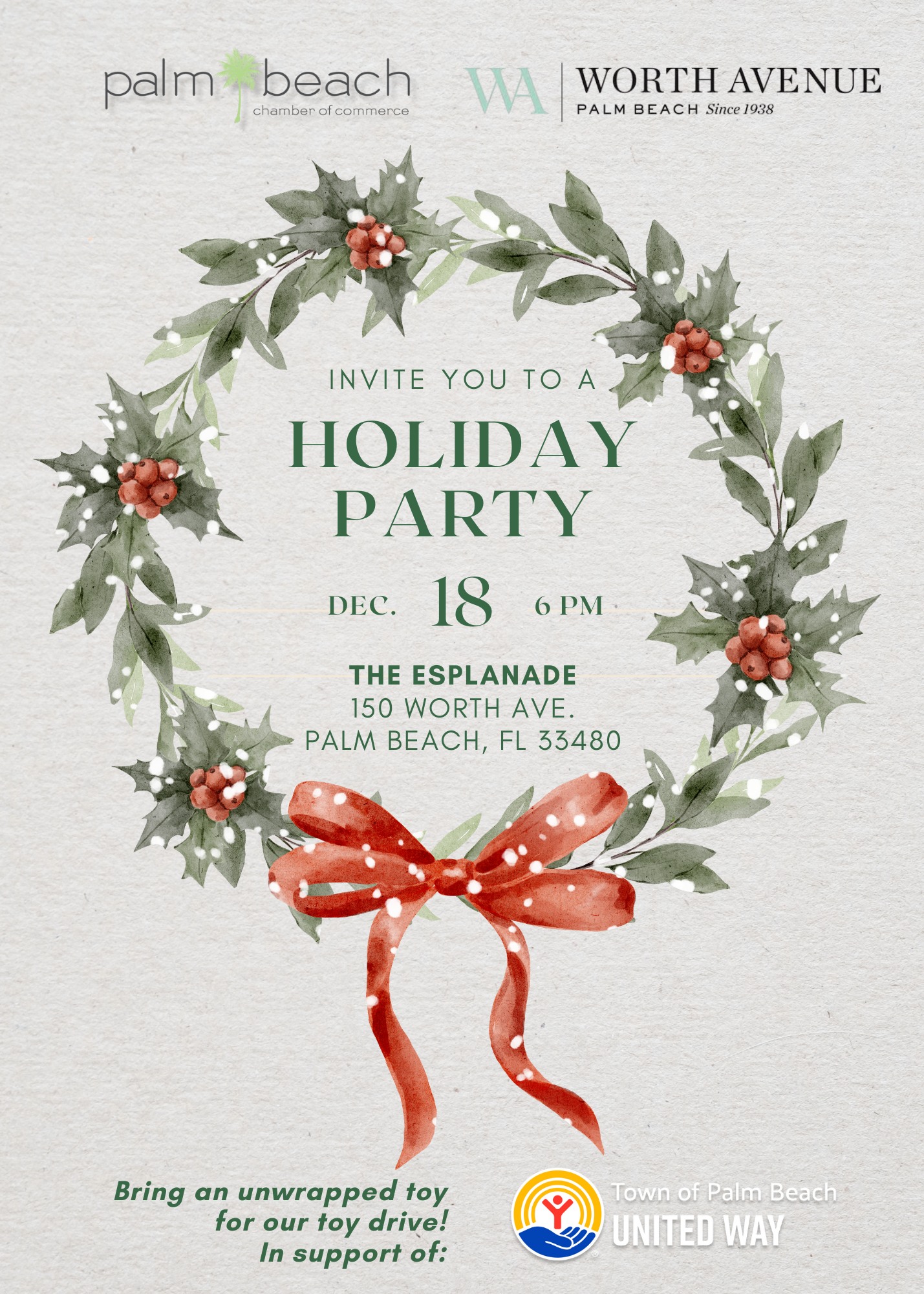 Celebrate the season with us at the annual Business & PBYP Holiday Party! This year, we’re thrilled to partner with the Worth Avenue Association to bring the festivities to the beautiful Esplanade. Join fellow business members and young professionals for a festive evening of connection, conversation, and holiday cheer. It’s the perfect opportunity to unwind, toast to a successful year, and enjoy the company of Palm Beach’s vibrant professional community in one of the island’s most iconic settings. Please bring an unwrapped toy for our toy drive in partnership with the Town of Palm Beach United Way! MUST BE REGISTERED TO ATTEND PBYP Members – Free Business Members - Free Guest/Non-Member - $100 All ticket purchases are non-refundable & non-interchangeable. You may not give your ticket to someone else. This event is strictly 21+. You will not be admitted if you are not of age. 2025 December Business + PBYP Holiday Party