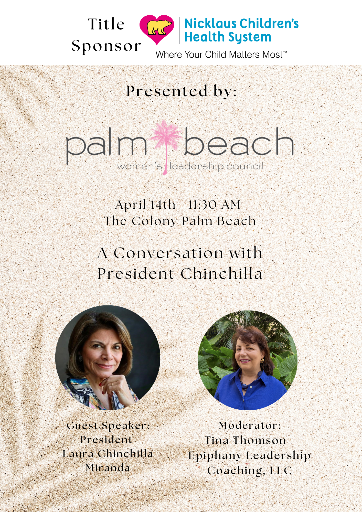 A Conversation with President Chinchilla Presented by Nicklaus Children’s Hospital, this highly anticipated program will feature Laura Chinchilla, former President of Costa Rica and the first woman elected to lead the nation (2010–2014). President Chinchilla is an internationally respected political scientist with a master’s degree in Public Policy from Georgetown University. Over the course of her career, she has served as Minister of Public Security, Congresswoman, Minister of Justice, and Vice President of Costa Rica. Her presidency was marked by significant reforms addressing public security and justice, digital and open government, women’s rights, early childhood protection, and environmental sustainability, particularly marine biodiversity preservation, for which she earned international recognition. Following her presidency, Mrs. Chinchilla has served as a consultant to leading global institutions including the Inter-American Development Bank (IDB), the United Nations Development Programme (UNDP), and USAID. She currently serves as President of the World Leadership Alliance – Club de Madrid and sits on the boards of the International Olympic Committee, the Inter-American Dialogue, the Concordia Summit, and the Euro-America Foundation. She has chaired the Kofi Annan Commission on Elections and Democracy in the Digital Age and led multiple Electoral Observation Missions throughout the Americas. Moderating the discussion will be Tina Thomson, CEO of Epiphany Leadership Coaching. A Professional Certified Coach (PCC) through the International Coaching Federation, Tina brings more than 25 years of executive leadership experience across business, education, and philanthropy. She currently serves as Executive Advisor to a Palm Beach–based family office and is a passionate advocate for women, youth, and education. The Women’s Leadership Council is co-chaired by Susan Kaplan of Fuoco Group & TFG Related Entities, Julia Murphy of Habitat for Humanity of Palm Beach County, and Lisa Rectenwald of Cartier, whose collective leadership continues to elevate meaningful dialogue and civic engagement within the Palm Beach community. Dana Herst of Nicklaus Children’s Hospital serves as Title Sponsor Chair, reinforcing the Council’s commitment to impactful programming. This exclusive luncheon will explore leadership on a global stage, examining democracy, governance in the digital age, sustainability, and the responsibility of influence in shaping future generations. Tables are currently available for purchase, and this event is expected to sell out. A limited number of photo opportunities with President Chinchilla will be available immediately following the luncheon. For sponsorship opportunities or table reservations, please contact the Palm Beach Chamber of Commerce. A special thank you to our Title Sponsor, Nicklaus Children's Hospital, and our Floral Sponsor, Welington Florist! Must Be Registered To Attend! $85.00 - WLC Members [Code Required] $100.00 - Non-WLC Members (Chamber Members) $175.00 - Non-Chamber Members2026 April Women's Leadership Council Luncheon